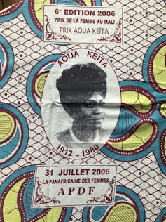 « Première femme députée du Mali. Aoua Keita ». Fresque murale située sur la colline de Koulouba à Bamako. Le griot Bazoumana Sissoko est l’auteur de la musique de l’hymne national du Mali. Author provided