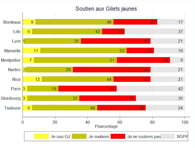 Pour répondre à ces questions, nous avons interrogé un panel de 1 000 répondants représentatifs des dix plus grandes villes françaises (Bordeaux, Lille, Lyon, Nantes, Marseille, Montpellier, Nice, Paris, Strasbourg et Toulouse) sur leur soutien et leur participation au mouvement des gilets jaunes. L’étude qui en résulte est disponible en ligne.